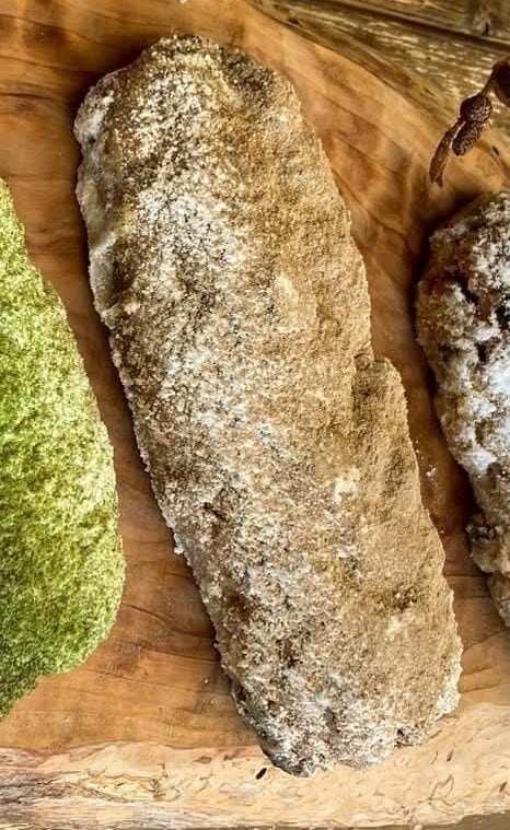 ほうじ茶パウダーをふんだんに使い、黒豆かのこと大納言かのこをたっぷり練り込み素焚糖(すだきとう)でしっとりと仕上げた上品な和菓子のようなほうじ茶シュトレン