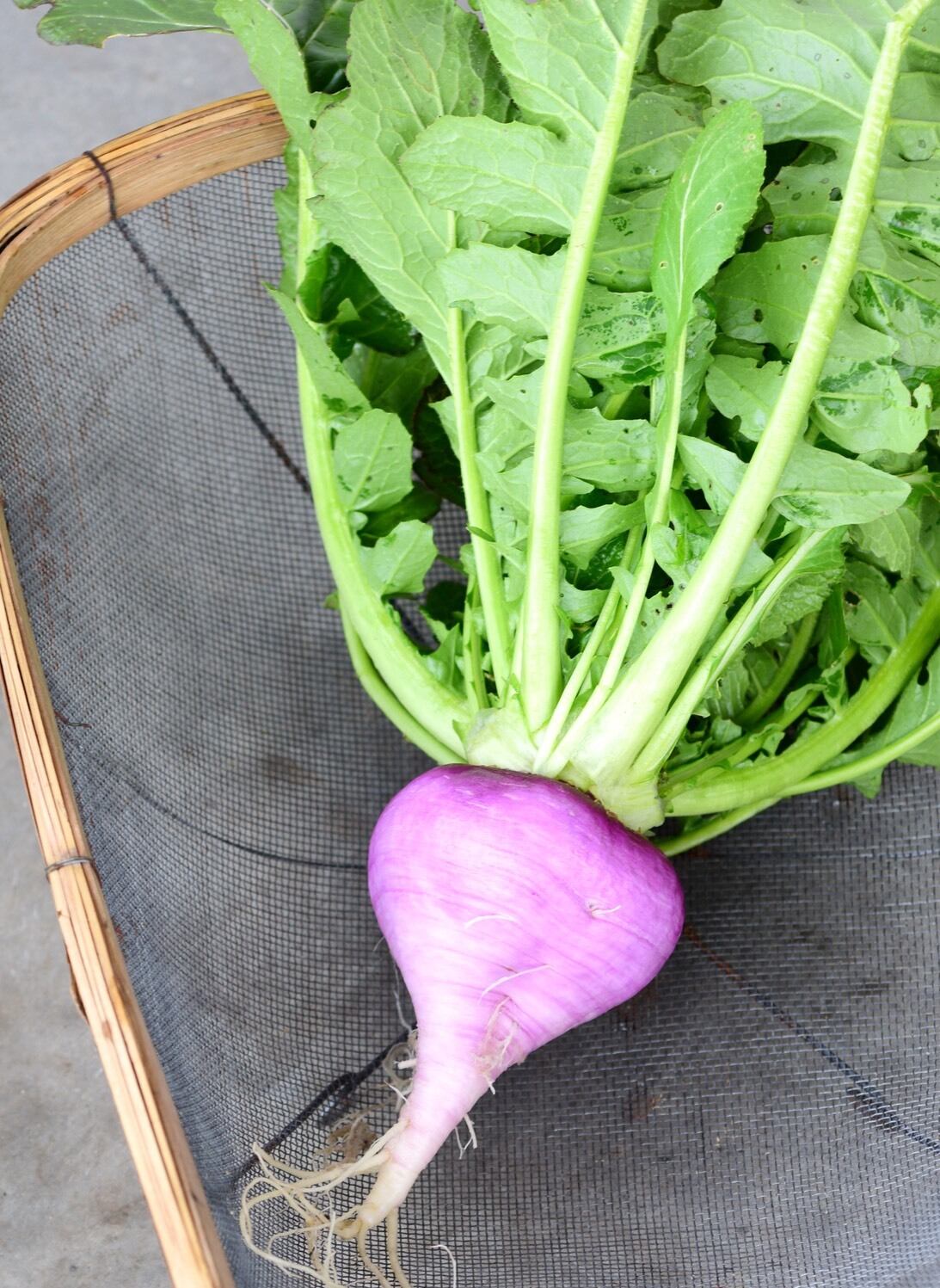 皮が紫で中は白いカブで、香りと甘みが豊かな5~8㎝くらいの中かぶです。