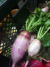 淡い紫色の小ぶりの大根。甘酢漬けや蒸し野菜の彩りにおすすめ。霜が降りるような寒い日が続くと辛味も抜けてきてサラダにもいいです。