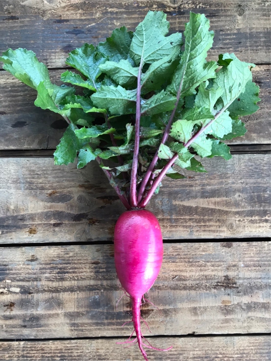 中身も赤く小ぶりの大根。甘酢漬けや蒸し野菜の彩りにおすすめ。霜が降りるような寒い日が続くと辛味も抜けてきてサラダにもいいです。