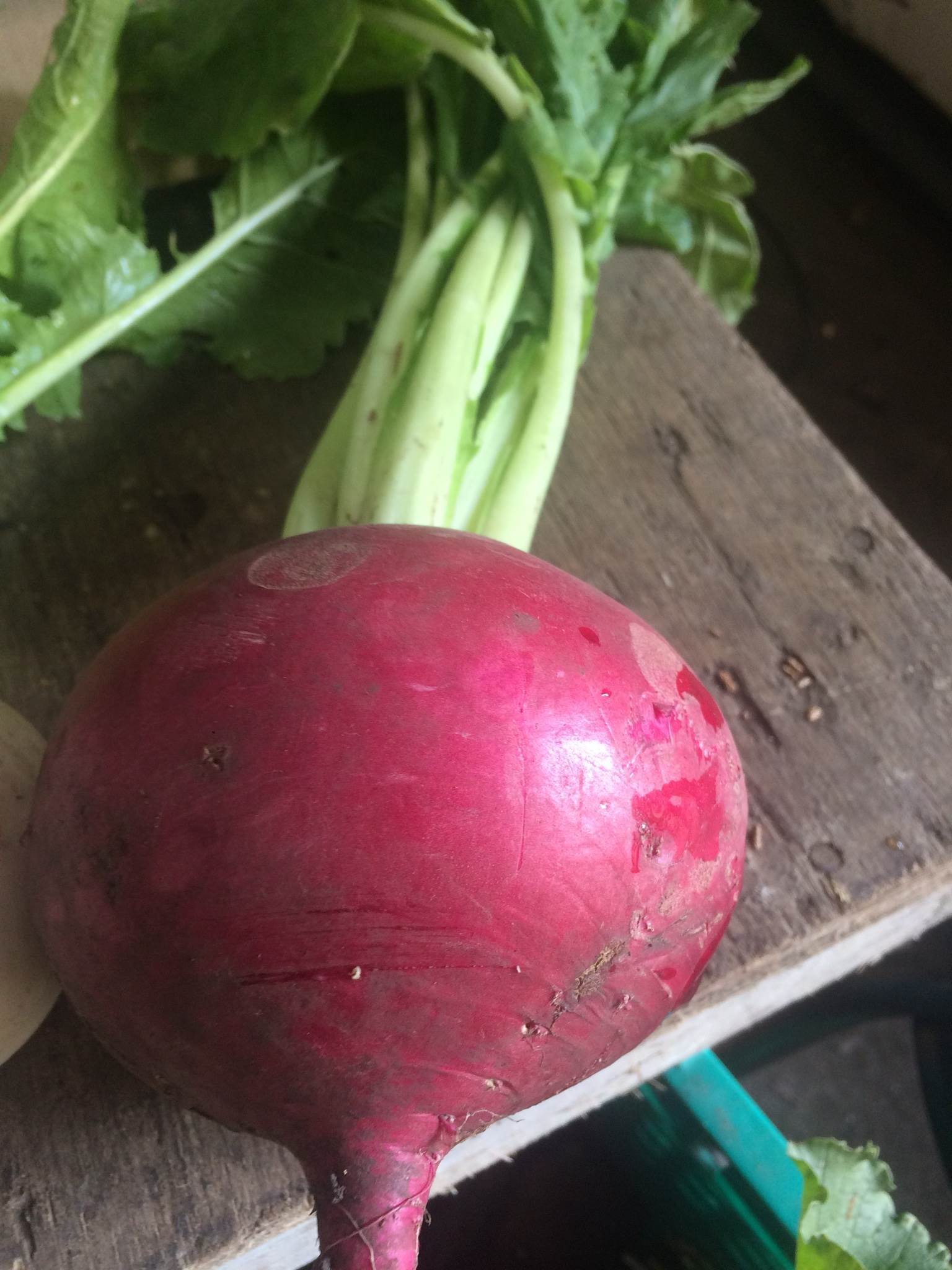 濃い赤のカブ、甘みもありサラダもおすすめ。